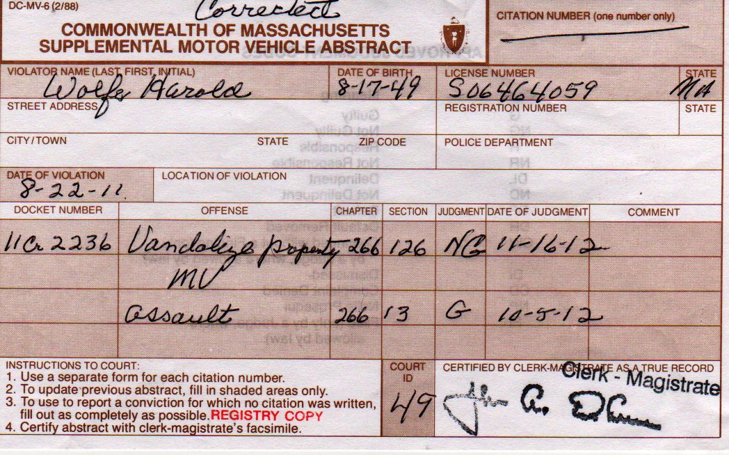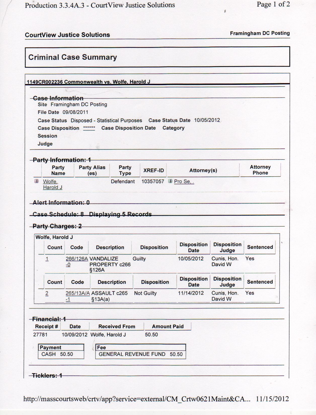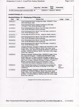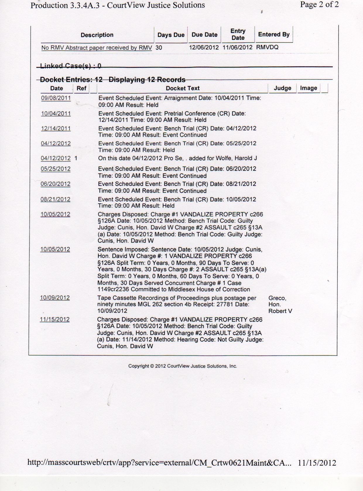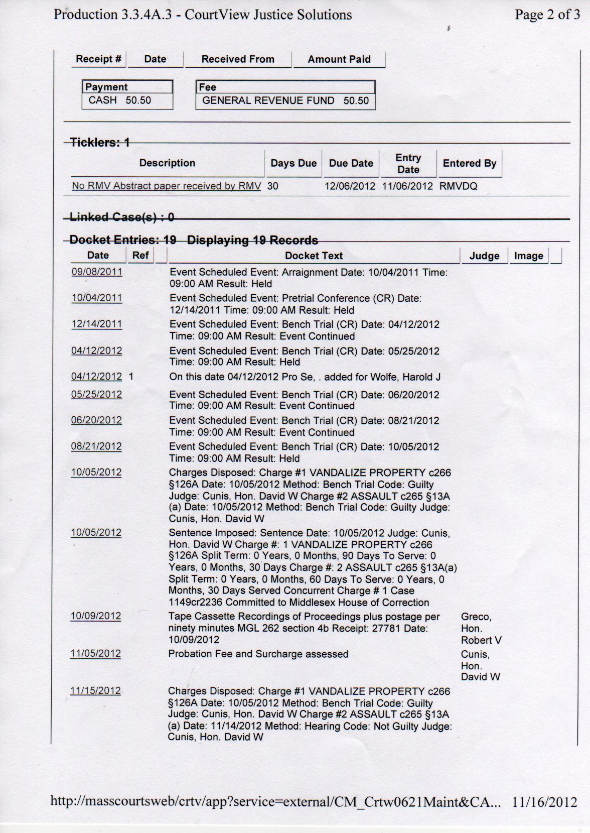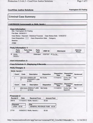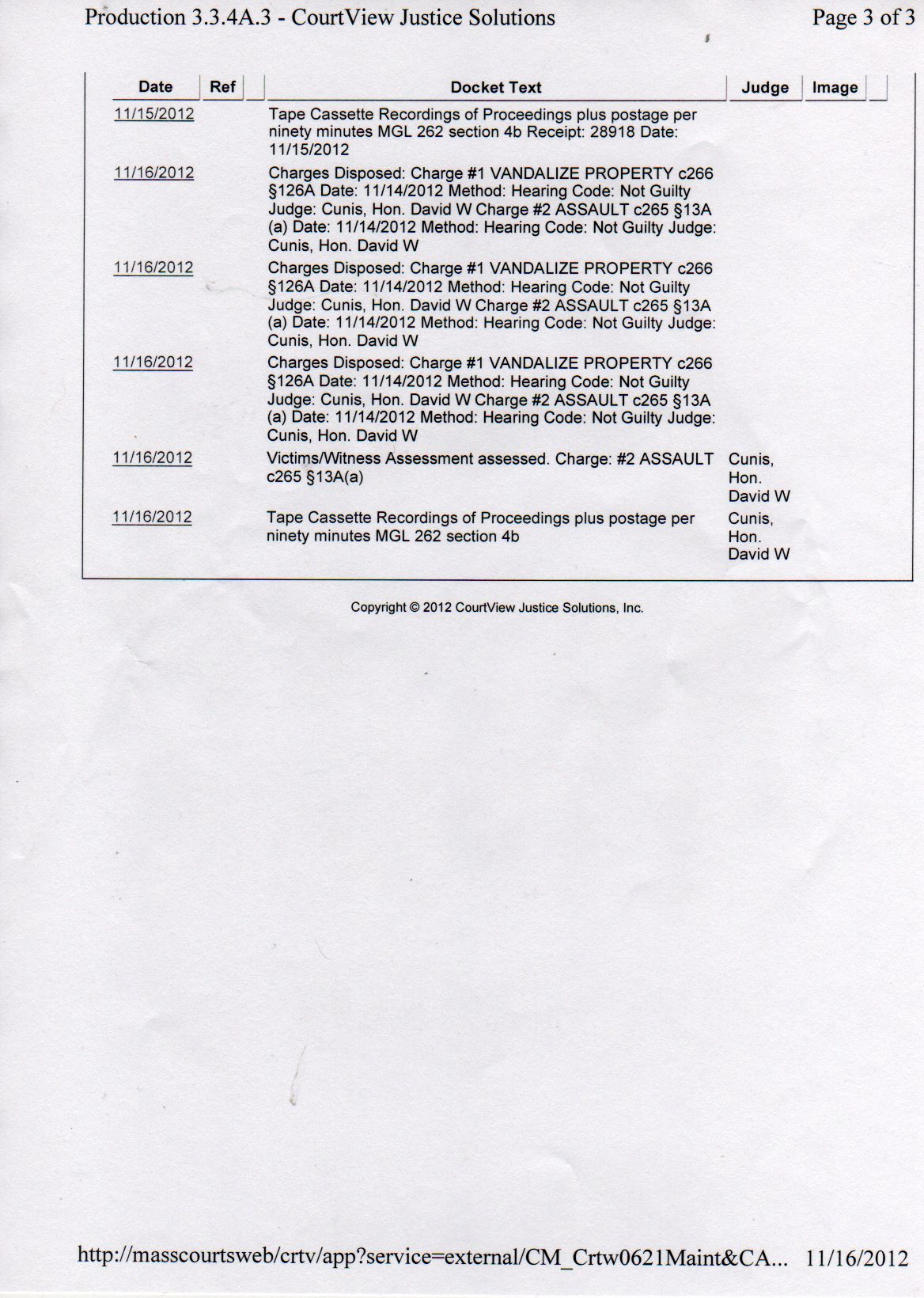 ![]() The next to last client was a young lady with an attitude. She had come up from the court room prison downstairs. As Robert V. Greco finished up with her, she was being led back downstairs and she shouted very loudly Robert Greco, you're a dick. When Robert V. Greco was finished I get the All rise and Robert V. Greco leaves and David W. Cunis comes in and I get called up front. David W. Cunis starts muttering into his microphone rather softly as though he did not want to be heard. He admitted that he had not seen any damage on her car door. The two of us had seen the door simultaneously in the trial on October 5, 2012 and it was the The Twilight Zone moment of the trial. He saw damage and I did not. The other charge of Assault ( MGL 265/13aa would stand, but that is so integrated in the Vandalize Property charge that it might also be swept aside. The next day around 1400 I requested a copy of the recording from the court for the usual $50.50 cost from the Clerk of Courts office. I also got the two pages shown below which made me think that my head would explode. Fortunately, for the janitorial staff, it did not. I can only speculate at this point that Judge Robert V. Greco who is the chief judge of the court, reviewed my case with David W. Cunis and did not see it as Judge David W. Cunis saw it. I go to court again today, November 16, 2012 in my continuing saga of injustice. Massachusetts Criminal Procedure Rule 25: Motion Required for Finding of Not Guilty Rule 25. MOTION REQUIRED FOR FINDING OF NOT GUILTY I am still mystified as to why he only vacated the felony damage but not the assault charge. In reviewing Stephanie Harris-Hodge's testimoney, the kicking of her car door was the assault, but the kicking (4-5 times according to her) produced no damage at all....so how did the assault occur. In essence, the two charges are integrated. This reversal is basically an admittance of judicial malpractice. David W. Cunis basically says My bad, let me forgive myself.. In the toiletry business, this might be called a crock of shit. |