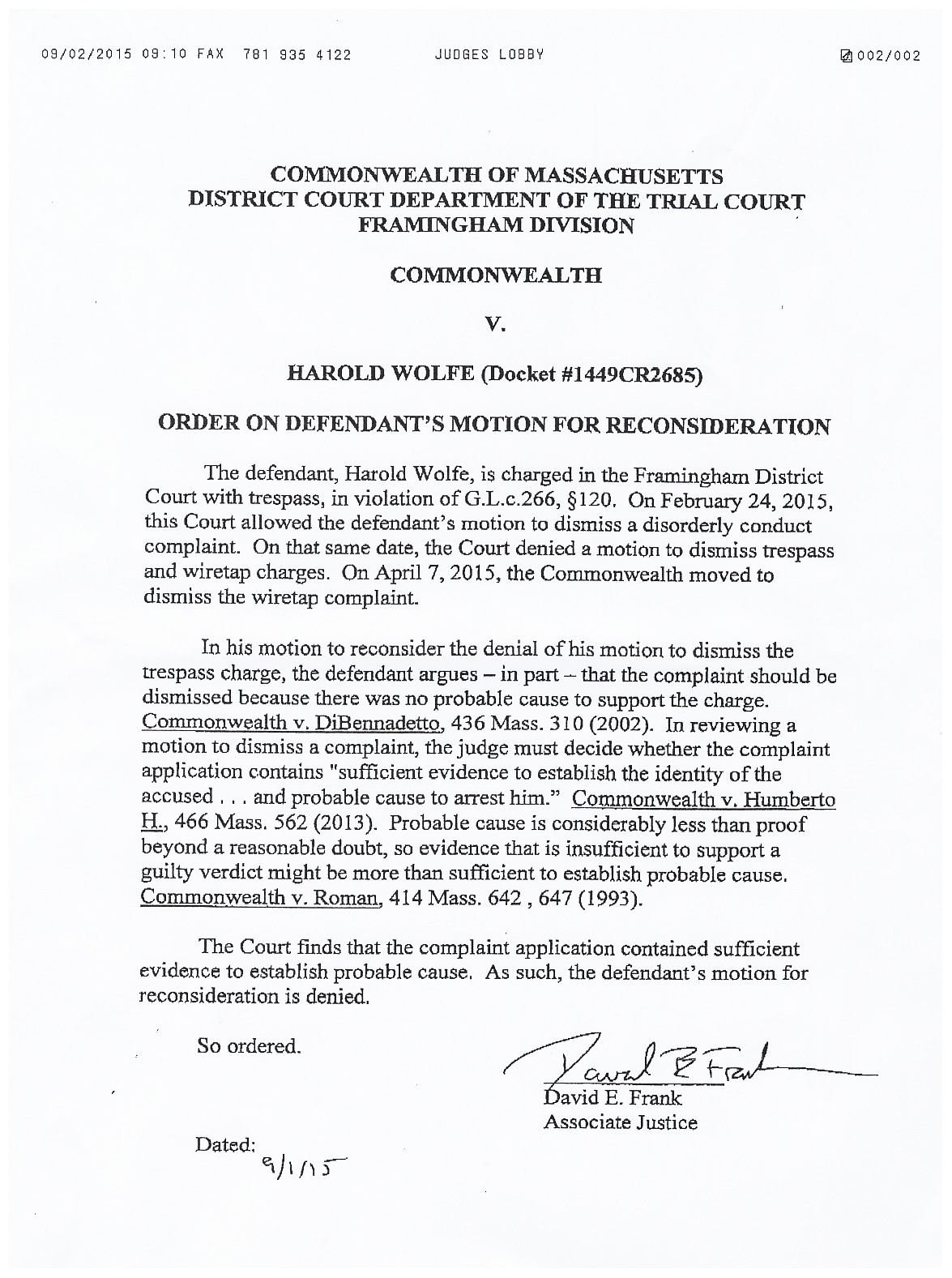 February 24, 2015 Filed a motion to dismiss the charge of trespassing and he failed to take note of the statement in the police report where Sgt. Michael Esposito stated that I could take pictures anywhere else in Shoppers World except the location where I stood. He misses the bogus nature of the trespassing charge against me. He believes that there is safe trespassing and unsafe trespassing on the same piece of property. It's too bad the trespassing law (MGL 266-120) does not make that distinction.